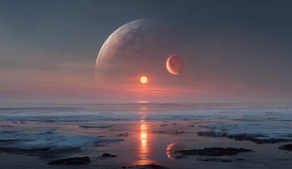 Alien sunset over frozen expanse.  A vibrant alien sunset paints a serene frozen landscape with icy reflections.  A large planet and a smaller moon glow in the sky above