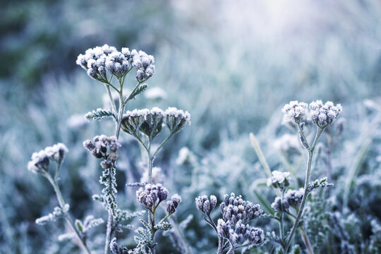 Some frozen beautiful aise-weed plants covered with icicles. Winter background. Free space for text. Selective focus. Shallow depth of field. Toned.