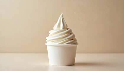 vanilla frozen yogurt swirl with chocolate syrup and crispy bits, served in plain white paper cup, white isolated background, clean dessert mockup