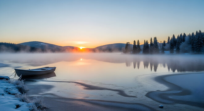 Tranquil winter sunrise over foggy lake with boat and snowy shoreline