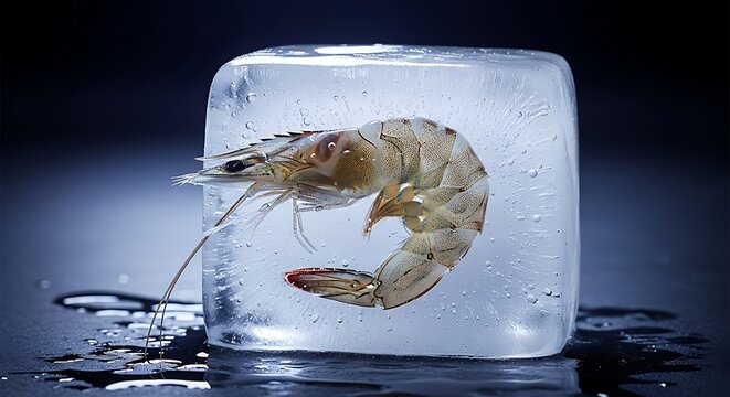 Frozen food delicacy: a shrimp trapped in an ice cube, a testament to food preservation and