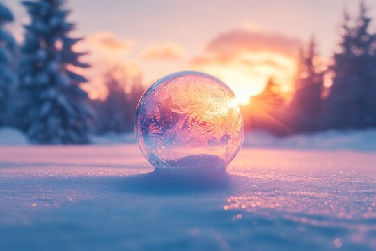 Macro shot of frosty soap bubble on snowy surface with sunlight