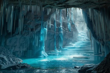 A breathtaking subterranean ice cave illuminated by a mystical blue glow, with frozen stalactites reflecting in the serene, crystal-clear water