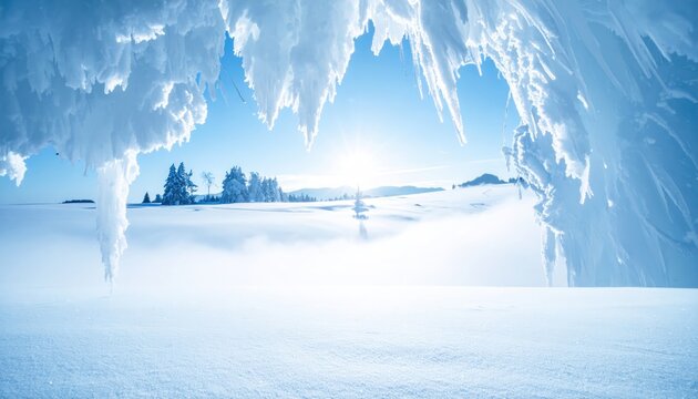 close up of icy stalactites on a frozen cliff under morning sunlight