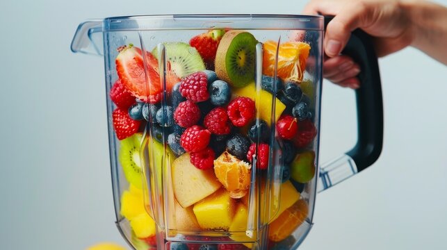 Hand holding blender filled with fresh fruit including strawberries, kiwi, and blueberries, ready to make a healthy smoothie.