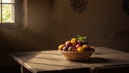 Wooden table, cafe backdrop, fruit display, advertising