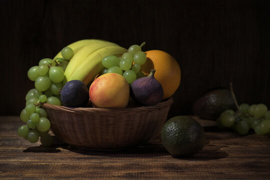 still life with fruit in a basket, bananas, grapes, nectirines, orange, figs and avocado