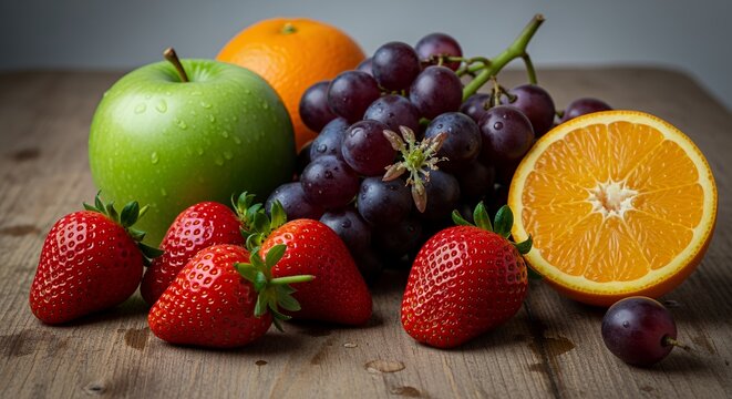 Vibrant Fruit Still Life: Apples, Strawberries, Grapes, and Oranges
