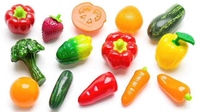 Plastic fruit and vegetable toy set on white background for kids store play