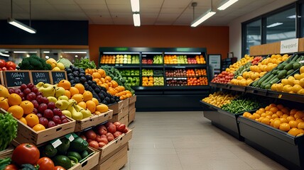 Fresh fruits and vegetables on shop stand in the supermarket or grocery store. Business healthy food concept.
