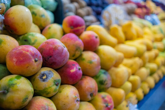 Close-up of a colorful fruit stand with fresh mangoes