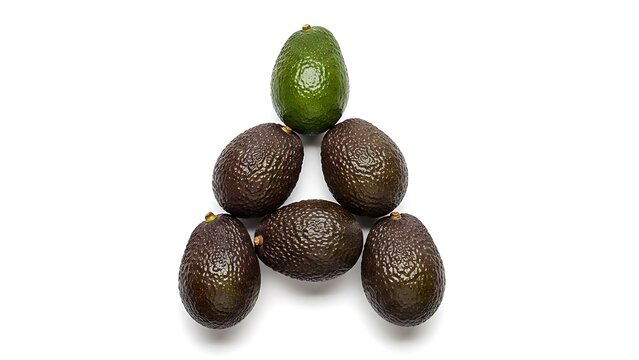 Arrangement of avocados in pyramid shape with ripe and unripe fruits
