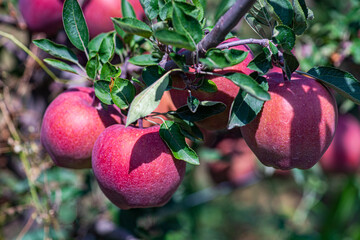 Close-up of ripe red apples growing on a tree in a garden, Georgia