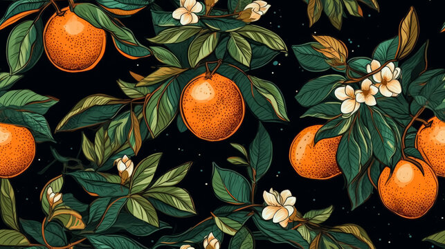 A drawing of oranges and leaves with a green background. The oranges are in various stages of ripeness, and the leaves are green and leafy. Scene is bright and cheerful, with the oranges