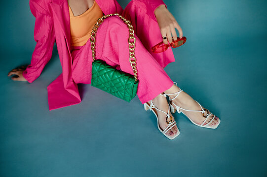 Fashion details: trendy green quilted leather bag with chunky chain, white strappy sandals, pink fuchsia color suit. Stylish woman outfit, accessories. Copy, empty space for text