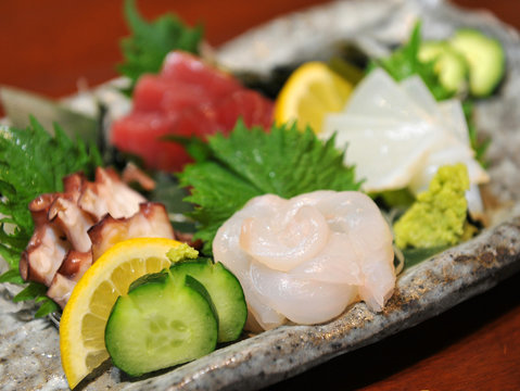 Fresh sashimi of fugu fish with cucumber, lemon and wasabi