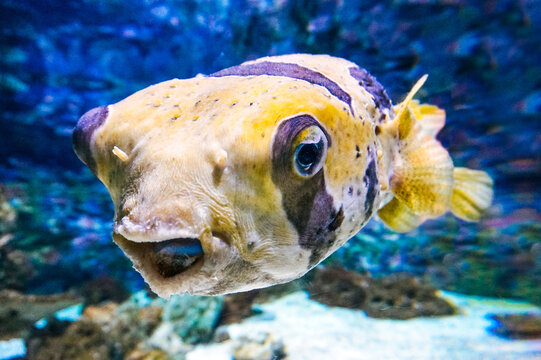Fugu puffer blowfish fish Arothron Hispidus in aquarium as nature underwater sea life background