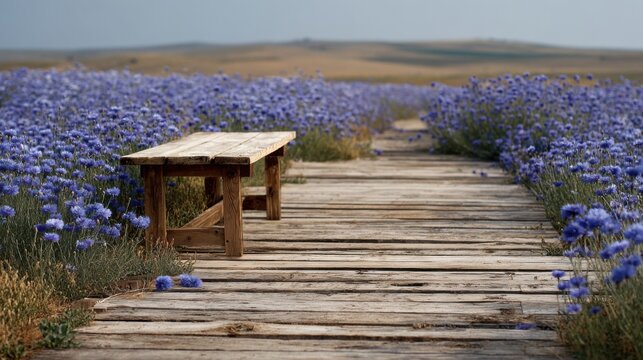 Summer wildflower meadow path with yellow flowers in full bloom. Dirt trail winds through lush green grass, tall plants under bright sunny sky. Scene evokes peaceful nature walks, outdoor exploration.