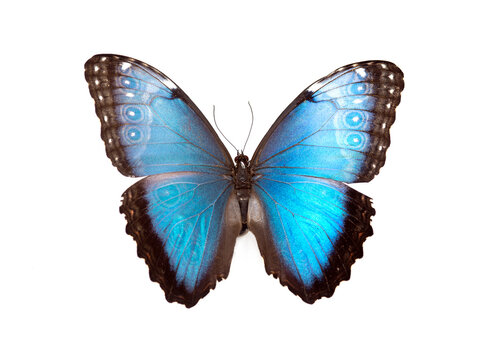 Bright blue butterfly with open wings, isolated on white background, detailed close-up of tropical insect in full symmetry.