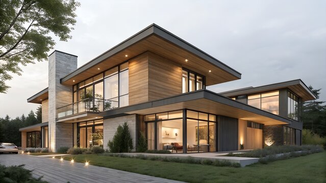 Elegant modern villa living room with wooden high ceiling and full height windows