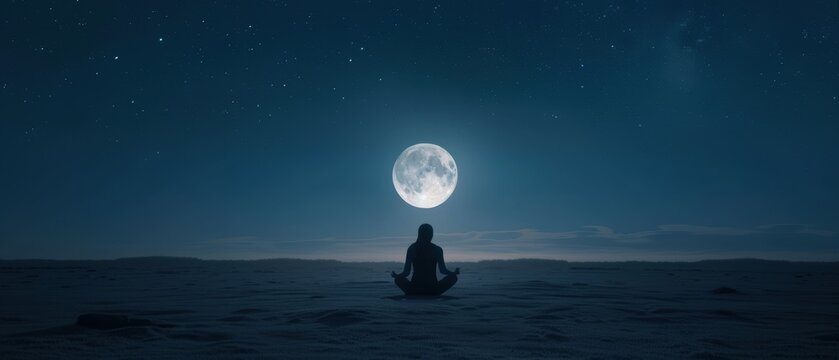 Person meditating under the full moon on a calm night, serene atmosphere with starry sky and lunar glow reflecting on water.