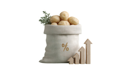 Burlap sack full of potatoes with percentage symbol and growth chart isolated on transparent background