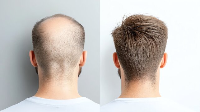 Comparison of male hair loss and restoration, highlighting the transformation from bald to full head of hair, back view.