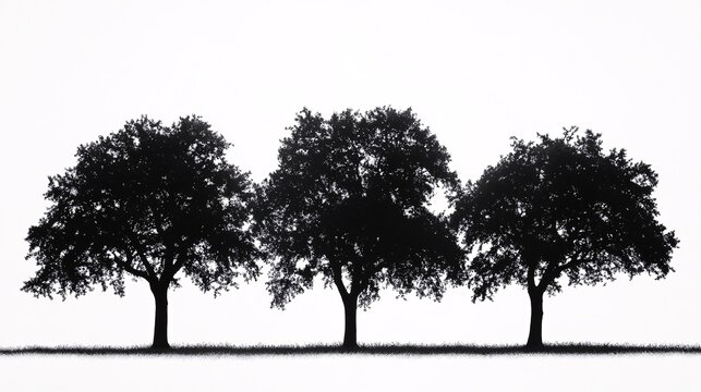 52.Three lush tree silhouettes with thick canopies, delicately outlined on a white background. The detailed outlines emphasize the fullness of each tree's foliage, creating a minimalist yet dynamic