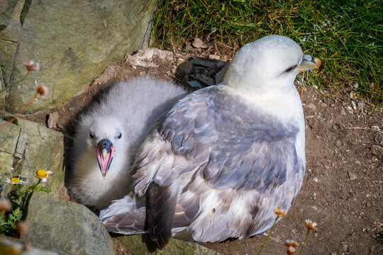 Northern fulmar chick in a nest on the cliffs of Handa Island