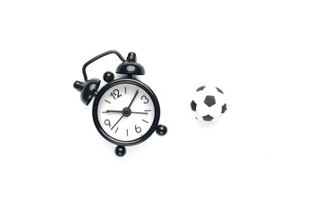 A picture of alarm clock and miniature ball. Football time concept.