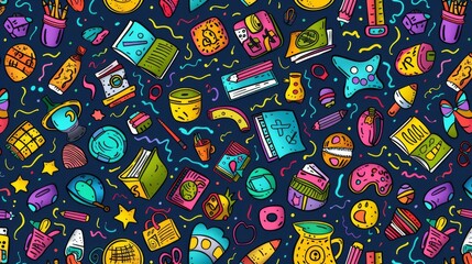 The image captures a vibrant collection of chaotic but colorful educational doodles featuring various icons like books, pencils, a globe, and school supplies on a deep blue background.