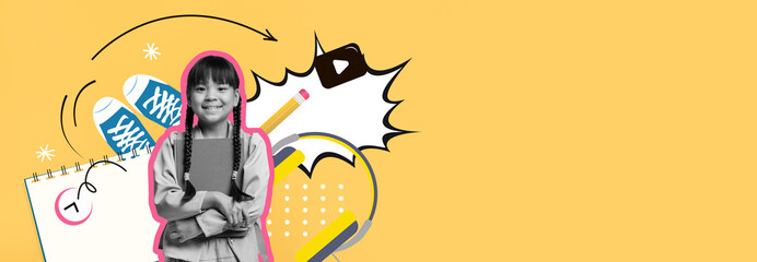 A vibrant and playful collage features a young girl smiling while holding school supplies. The background is bright and colorful, emphasizing her joy and creativity.