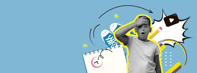 A joyful child with curly hair points enthusiastically amidst a colorful collage featuring school supplies and digital elements. The vibrant yellow background enhances the playful mood.