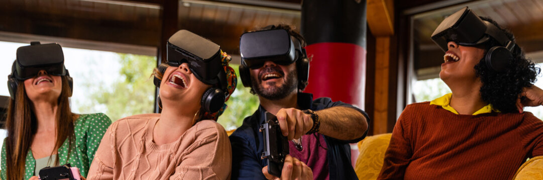 Multiracial young students and diverse friends wearing virtual reality glasses indoor – multicultural young people having fun new technology vr headset goggles - horizontal web banner size for header