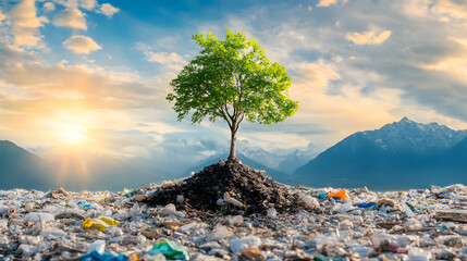 Digital cube over landfill depicting pollution and recycling