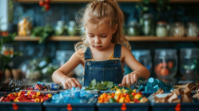 A young girl happily sorts recyclables into colorful bins, embracing eco-friendly habits