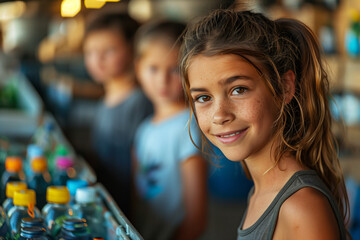 A family sorting recyclable materials into designated bins at a recycling center, emphasizing environmental consciousness.A girl with a smile stands in front of bottles of water at a party