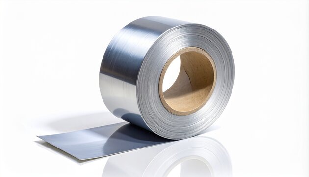 Large roll of shiny aluminum foil partially unspooled on white surface—symbolizing utility, reflection, and the industrial choreography of material science and engineered form.
