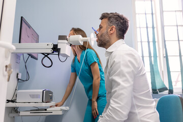 Man testing breathing function by spirometry. Diagnosis of respiratory function in pulmonary disease