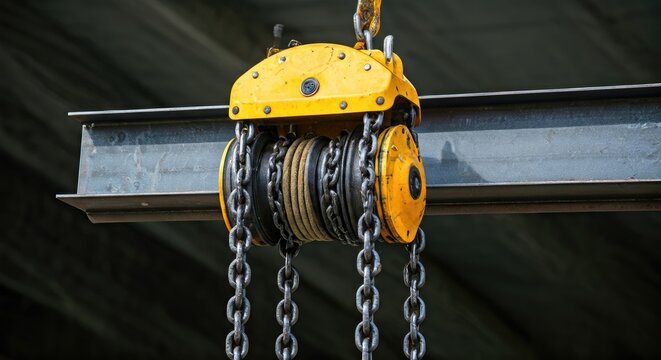 Chain Hoist and Hand Winch, old condition, long used, placed on the floor. A hoist that uses a chain is an important part in helping to lift things. The rusty chain and the pulley and hook are orange.
