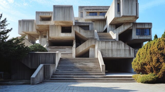 Brutalist design featuring rough, unadorned concrete and large-scale geometric structures