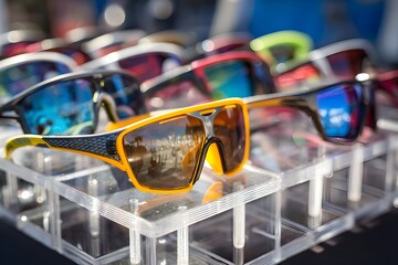 Sports sunglasses arranged on rotating display stand highlighting modern eyewear variety functionality for active lifestyles