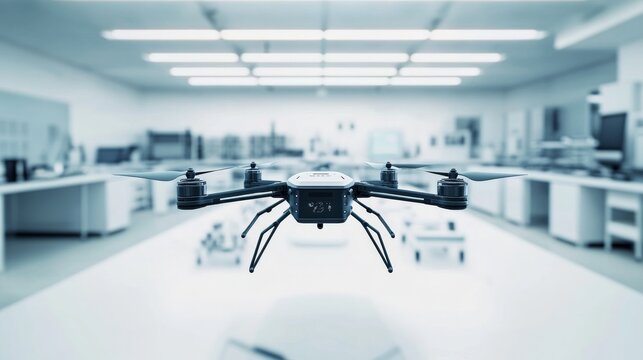 A high-tech autonomous drone with advanced navigation sensors displayed in a clean, modern tech lab, showcasing sleek design and functionality