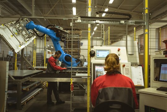 Industrial worker operating machinery in factory