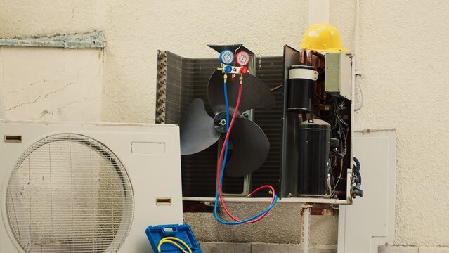 Faulty condenser with protection cover removed in need of mending, with defective electric internal parts. External air conditioner not functioning anymore, ready to be repaired, zoom in tilt up shot
