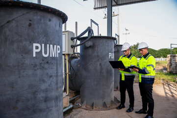 A specialist engineer and an inspector are working together to check the high pressure water pump of a wastewater treatment plant to ensure it is functioning according to standards.