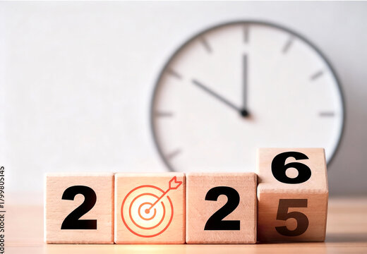 Imagem criativa e moderna de blocos de madeira alinhados, representando a virada do ano de 2025 para 2026, com números destacados, relógio e alvo estilizados, fundo claro e toque elegante