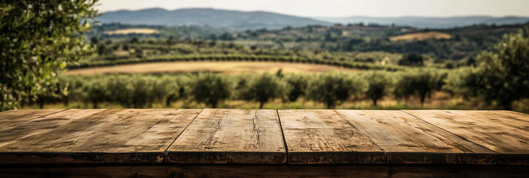 Mesa de madeira rústica ao fundo uma plantação de oliveiras