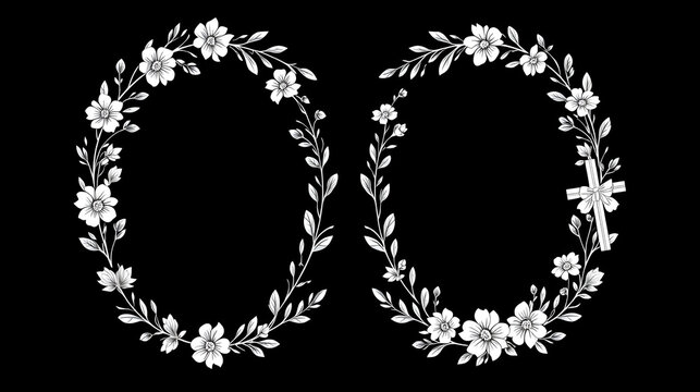 Funeral vector frames, isolated wreaths of floral design with crosses, leaves and flourishes. Mourning condolence cards. Obituary mournful funereal monochrome memorial borders, laurel wreath