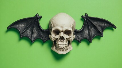 A close-up shot on a vivid green surface displaying a plastic skull with dark bat wings attached, creating a spooky Halloween decoration